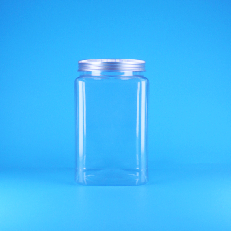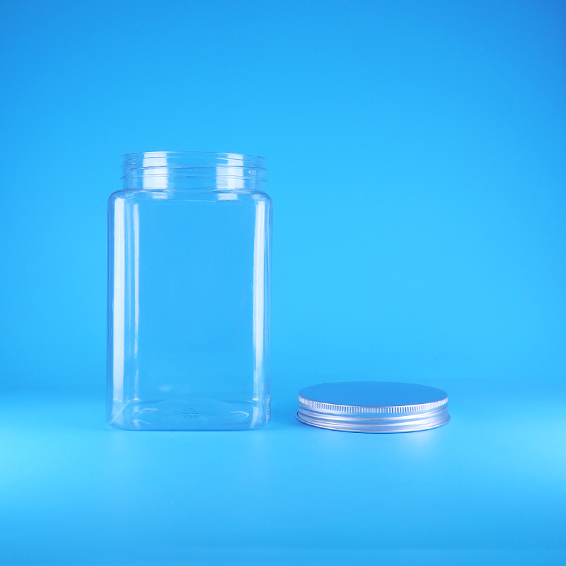 安価な透明空の正方形中国PETプラスチックキャンディージャーバルクスクリューアルミニウムキャップ